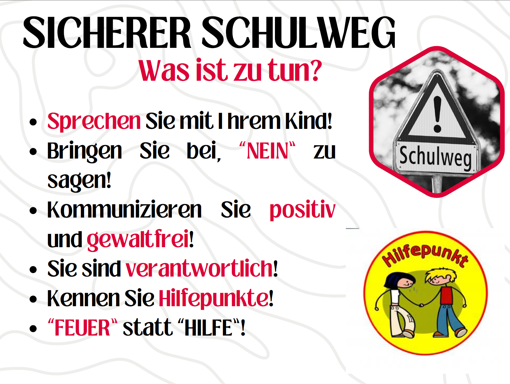 Das allerwichtigste ist tatsächlich: Die Verantwortung für den Schulweg liegt bei Ihnen. Wird ihr Kind belästigt, bedroht, geschlagen… - dann erstatten Sie unbedingt Anzeige bei der Polizei!